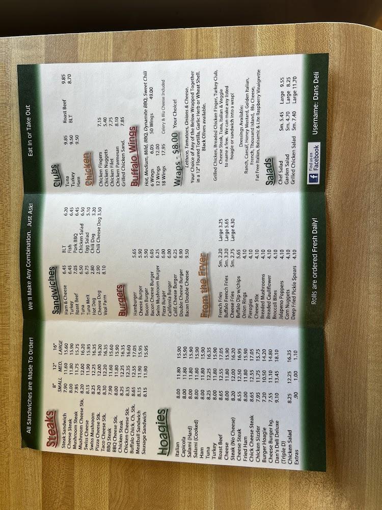 Dan's Deli menu has something for everyone. Cold sandwiches, grilled options, and fried treats offer variety. Dine-in or take-out, each meal honors simplicity and taste. Popular dishes include cheeseburgers, chicken fingers, and pizza burgers. Prices are reasonable, making it easy to enjoy multiple dishes.