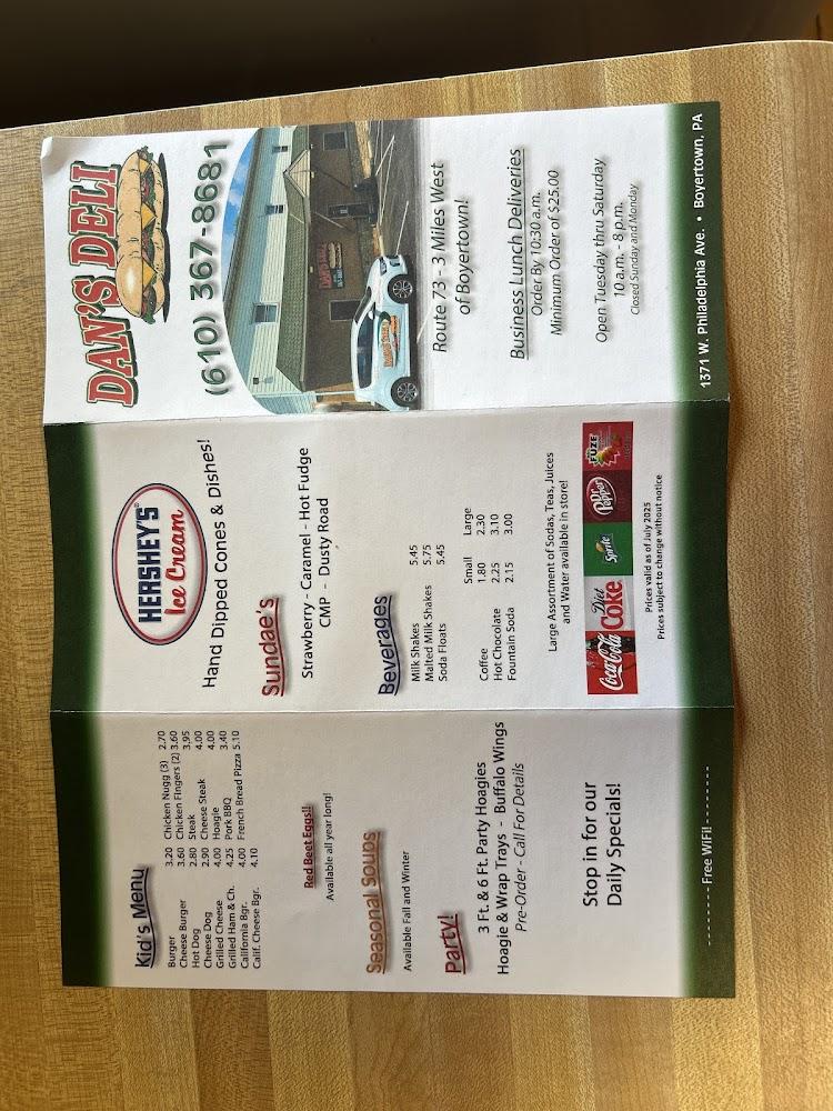 Welcome to Dan's Deli, a cherished family-owned gem in Boyertown, PA, serving the community for 35 years with a commitment to exceptional customer service and quality food. Our menu features a delectable variety of cold sandwiches, grilled favorites, and crispy fryer delights, alongside delightful treats such as Hershey ice cream and Peter Piper's pickles. Perfect for any occasion, we offer party hoagies and trays that will impress your guests. Enjoy our relaxed atmosphere, accessible seating, and a welcoming vibe whether you're dining in or taking out. Visit us today at 1371 W Philadelphia Ave and experience the taste of tradition!